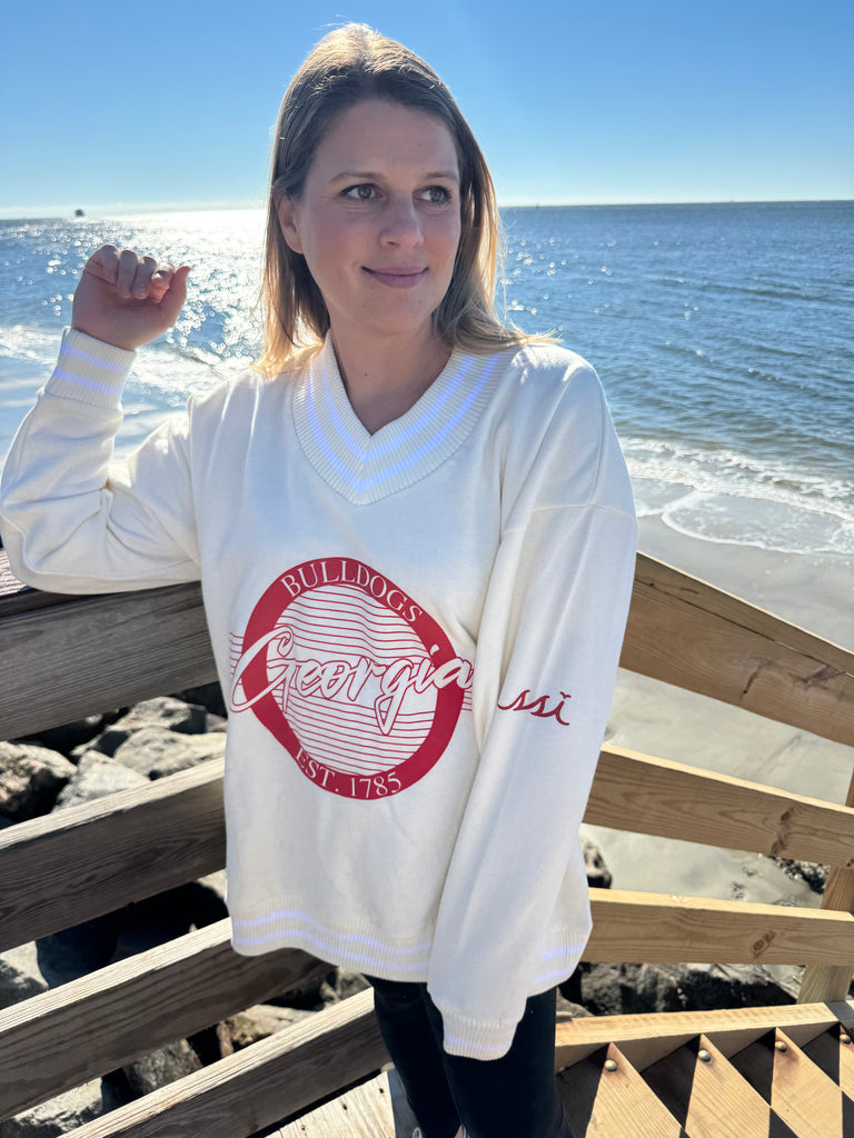 Offwhite V-Neck UGA Long Sleeve Sweatshirt w/ Red SSI logo