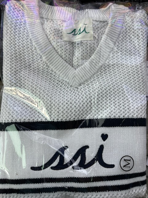 White V-Neck Crochet Sweater w/ Navy SSI Logo and Heart dotting i